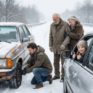 The man wore a thin jacket that looked inadequate for the weather, and his hands, covered in threadbare gloves, were shaking as he tried to loosen the lug nuts on the tire. The woman stood a few feet away, arms wrapped tightly around herself, her gray hair whipping in the wind that cut across the open highway. Her face was turned away from the road, but I could see the slump in her shoulders, the exhaustion that went beyond physical cold.